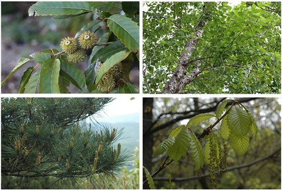 ▲ 이산화탄소 흡수 효과가 상대적으로 뛰어난 추천수목별 사진 일부 (왼쪽 위부터 시계방향으로 상수리나무, 물박달나무, 졸참나무, 소나무).(사진=환경부) |