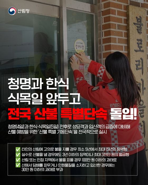 산림청은 4일 '청명'과 5일 '한식' 및 '식목일'을 전후로 성묘객과 입산객의 급증에 대비해 산불 예방을 위한 '산불 특별 기동단속'을 전국적으로 실시한다고 밝혔다.