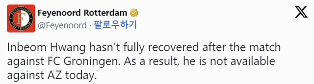 결국 그가 다쳤다는 뜻이다. 페예노르트는 선발 라인업을 발표하면서 공식 SNS에 황인범은 직전 경기인 흐르닝언전 이후 완전히 회복하지 못했다. 이에 따라 알크마르전에선 빠진다고 설명했다.