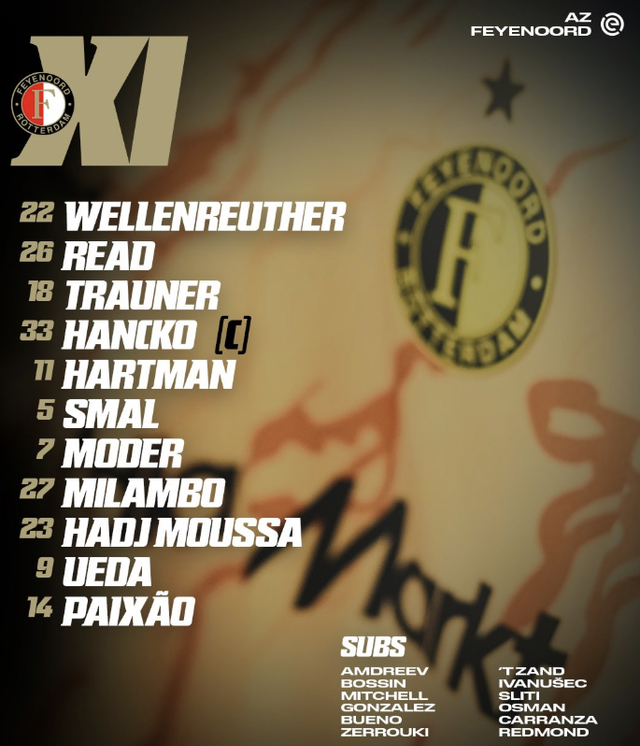 지난달 페예노르트에 부임한 월드클래스 스트라이커 출신 로빈 판 페르시 감독은 이날 선발 라인업으로 티몬 벨렌로이터(골키퍼), 퀼린드시 하트만, 다비드 한츠코, 게르노트 트라우너, 히바이루 리드, 안토니 밀람보, 야쿠브 모더, 기스 스말, 이고르 파이샹, 우에다 아야세, 아니스 무사를 올렸다.