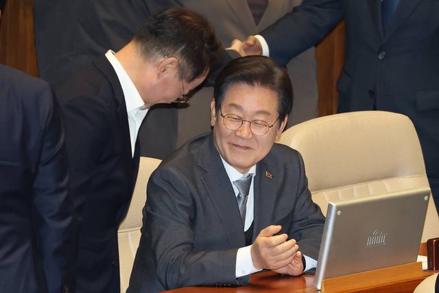 이재명 더불어민주당 대표가 지난 4일 오후 서울 여의도 국회에서 열린 본회의에서 의원들과 인사나누고 있다 / 뉴스1