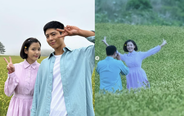 사진 속 아이유는 젊은 애순 역으로 호흡을 맞춘 관식 역 박보검과 다정하게 포즈를 취하고 있다. 두 사람은 유채꽃밭을 배경으로 분홍 원피스와 청록 셔츠를 입고 나란히 서있는가 하면 신난듯 아이유가 폴짝 뛰는 모습을 박보검이 카메라로 찍는 모습이 포착되기도 했다. 또 비에 젖은 분장을 하고 찍은 다정한 셀카도 눈길을 끌었다.