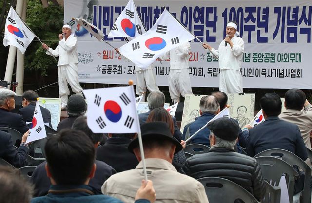 2019년 11월 10일 오후 대구 중구 2.28기념중앙공원에서 열린 조선의열단기념사업회 대구지회·독립투사 민족시인 이육사기념사업회 공동주최 '시민과 함께하는 의열단 100주년 기념식'에서 영남민요연구회가 태극기를 흔들며 광복군(의병)아리랑 공연을 선보이고 있다. 조선의열단은 1919년 11월 9일부터 이튿날까지 중국 지린성(吉林省) 바후먼(巴虎門) 밖 대구 출신 의열단 부단장 이종암의 집에서 약산 김원봉, 서상락, 신철휴 등 신흥무관학교 출신을 비롯해 청년 10명이 모여 독립을 쟁취하기 위해 조직한 항일 민족·민중무장투쟁단체이다. / 뉴스1