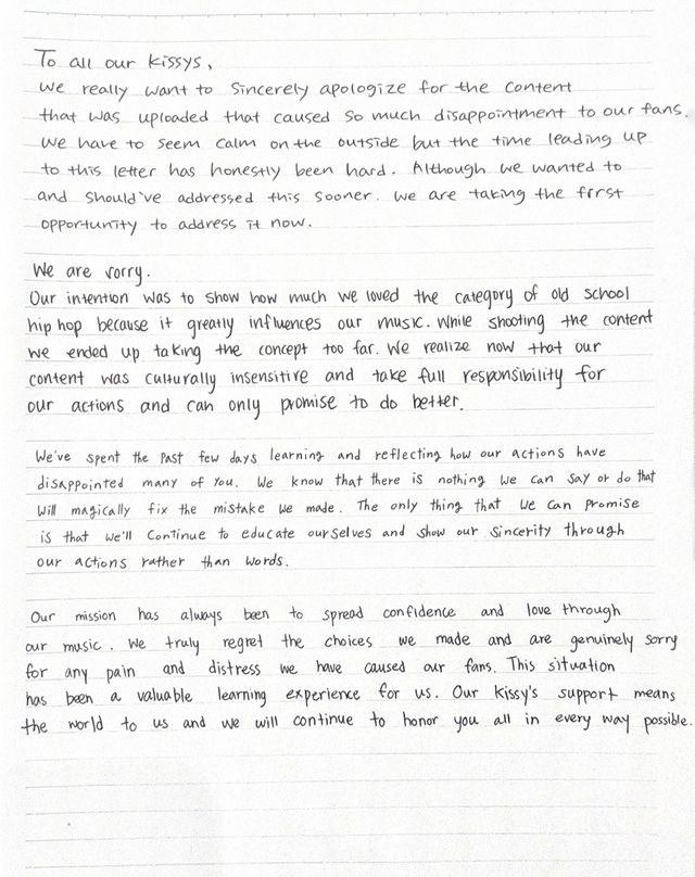 이어 해당 콘셉트를 연출한 것에 대해 "올드스쿨 힙합 장르를 얼마나 사랑하는지를 보여드리는 것이었는데, 지금 와서 그 콘텐츠가 문화적으로 민감한 사안임을 인지하게 됐다"라고 반성한 뒤 "지난 며칠간 저희의 행동을 되돌아보는 시간을 가졌다. 저희가 약속드릴 수 있는 것은 앞으로 계속해서 배우고 행동으로 진심을 보여드리겠다는 점이다"라고 강조했다.