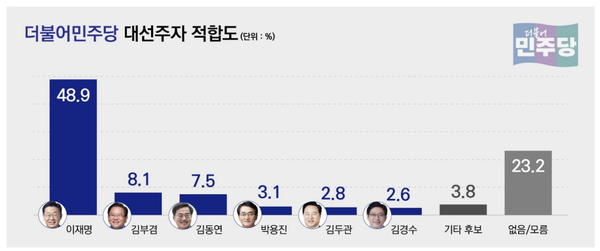 민주당 대선주자 적합도 조사에서는 이재명 대표가 48.9%를 기록한 가운데 김부겸 전 총리 8.1%, 김동연 경기지사 7.5%, 박용진 전 의원 3.1%, 김두관 전 지사 2.8%, 김경수 전 지사 2.6% 등으로 나타났다.