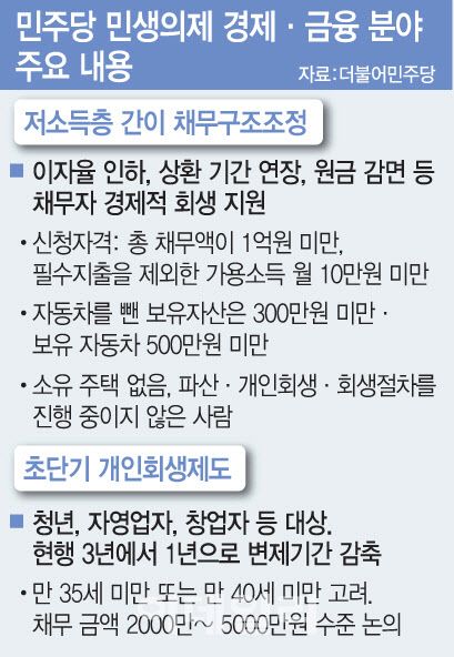 현행 ‘채무자 회생 및 파산에 관한 법률’에 따르면 개인회생 절차에서 변제계획 기본 기간은 3년(36개월)로 설정돼 있고 특정 경우에만 변제 기간을 조정할 수 있다. 이에 민주당은 청년층, 자영업자, 창업자를 대상으로 변제기간을 1년으로 설정하는 초단기 채무조정제도를 구상 중이다. 구체적인 연령 기준이나 채무액 수준은 아직 정해지지 않았다. 현재로선 만 35세 미만 또는 만 40세 미만을 고려 중이다. 채무 금액 역시 2000만원에서 5000만원 사이 수준을 논의하고 있다.