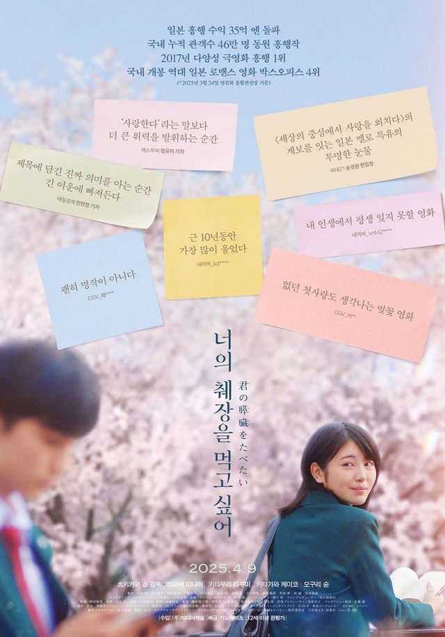 이어서 공개된 ‘포스트잇 리뷰’ 포스터는 만개한 벚꽃을 배경으로 ‘나’를 몰래 훔쳐보고 있는 ‘사쿠라’의 모습이 어우러져 찬란한 봄의 감성을 고스란히 담아낸다. “일본 흥행 수익 35억 엔 돌파”, “국내 누적 관객수 46만 명 동원 흥행작”, “2017년 다양성 극영화 흥행 1위”, “국내 개봉 역대 일본 로맨스 영화 박스오피스 4위”(*2025년 3월 24일 영진위 통합전산망 기준)라는 카피 문구들은 <너의 췌장을 먹고 싶어>가 2017년 개봉 당시 거둔 성과들을 한눈에 보여주며 작품성과 흥행력을 동시에 입증한다.