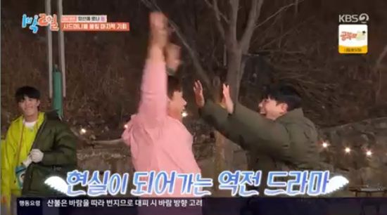 문세윤은 다리찢기로 엔딩포즈를 취하며 역전 드라마 성공에 같은 팀 이준과 얼싸안고 환호했다.