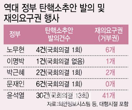 6일 정치권에 따르면 윤석열 정부(2022년 5월~2025년 4월) 기간 야당이 발의한 탄핵소추안은 무려 30건에 달한다. 이는 직전 19년간 4개 정부(노무현·이명박·박근혜·문재인정부) 기간 탄핵소추안 발의횟수(총 13건)와 비교해도 무려 2.3배나 많았다. 야당은 윤 정부 집권기간 매달 약 0.9건의 탄핵소추안을 발의한 셈이다.