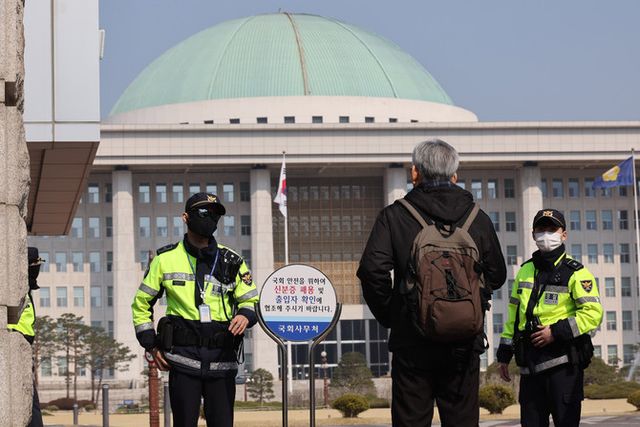 윤석열 대통령 탄핵심판 선고 전날인 4월3일 국회경비대원이 국회 앞에서 출입증을 확인하고 있다. ⓒ 연합뉴스