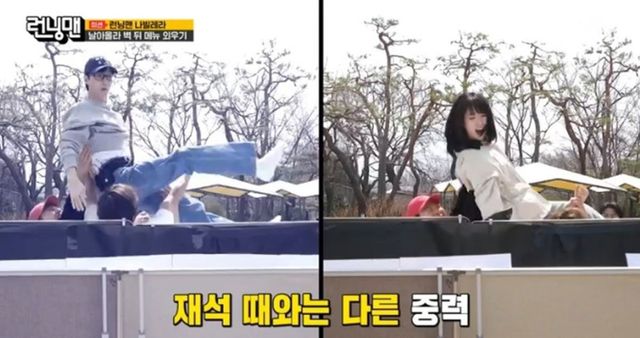 미션은 유재석, 송지효, 지예은이 대표로 출전한 가운데, 지예은을 들어 올린 멤버들은 “좀 다르다”며 놀라워했고 헹가래가 끝난 후 유재석은 “토할 것 같아”고 말해 ‘지예은 몸무게 논란’에 불을 지폈다.