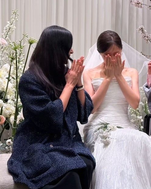 공개된 사진 속 고소영은 신부 대기실에서 웨딩드레스를 입고 있는 효민의 옆에 앉아 박수를 치며 축하해주고 있으며, 고소영과 지인의 사이에 앉은 효민은 부끄러운 듯 손으로 얼굴을 가리고 있어 훈훈함을 자아낸다.