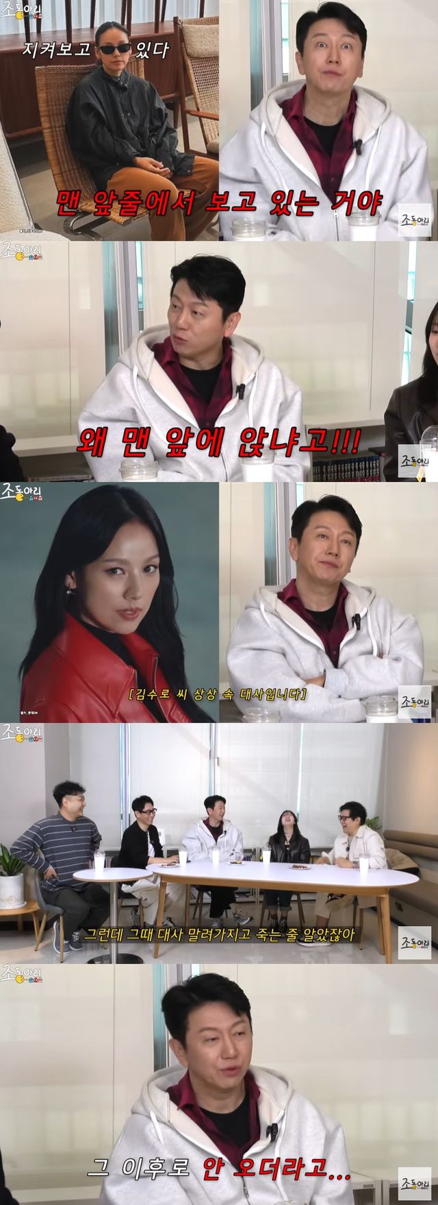 6일 김용만, 지석진, 김수용이 운영하는 유튜브 채널 '조동아리'에는 '잘나가던 김수로가 방송에서 갑자기 사라진 이유|진지희에게 던진 첫 평가 "얘처럼 연기하면 떨어져"'라는 제목의 영상이 게재됐다.