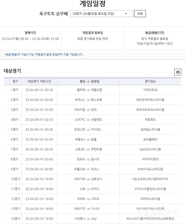 한편 스포츠토토코리아는 2024년 11월부터 ‘체육진흥투표권 적중결과 QR코드 조회 서비스’를 도입해 운영 중이다. 이용자는 투표권 우측 상단의 QR코드를 스마트폰으로 스캔해 손쉽게 당첨 여부를 확인할 수 있다. 축구토토 승무패 25회차 적중 결과 및 26회차의 자세한 일정은 공식 온라인 발매사이트 베트맨을 참고하면 된다. 경기 분석 내용 등은 베트맨 내 토토가이드 페이지에서 확인할 수 있다.