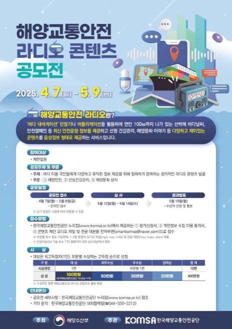 해양수산부가 주최하고 한국해양교통안전공단이 주관하는 이번 공모전은청취자들의 창의적인 아이디어가 반영된 바다내비 라디오 콘텐츠를 발굴하기 위해 마련됐으며 해양안전, 선상건강관리, 해양문화‧상식 등3개 부문에 대해 공모를 진행한다.