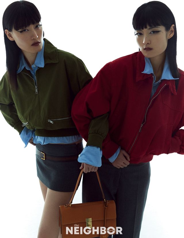 (왼쪽) 스포티한 디자인의 올리브그린 컬러 포플린 재킷 4백70만원, 트롱프뢰유 효과를 연출하는 입체적인 벨트 프린트 장식의 미니스커트 2백60만원, 블루 코튼 셔츠 가격 미정, 앰버 색상의 소프트 사운드 미디엄 가죽 숄더백 5백35만원.