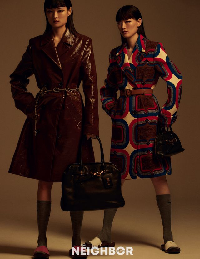(오른쪽) 아카이브에서 가져온 컬러풀한 기하학 프린트가 강렬한 무드를 자아내는 울 코트, 그레이 삭스와 화이트 페이턴트 레더 클로그 모두 가격 미정, 로고를 각인한 골드 톤 버클이 특징인 레더 벨트 93만원, 스몰 사이즈 아방뛰르 나파 레더 톱핸들백 5백20만원.