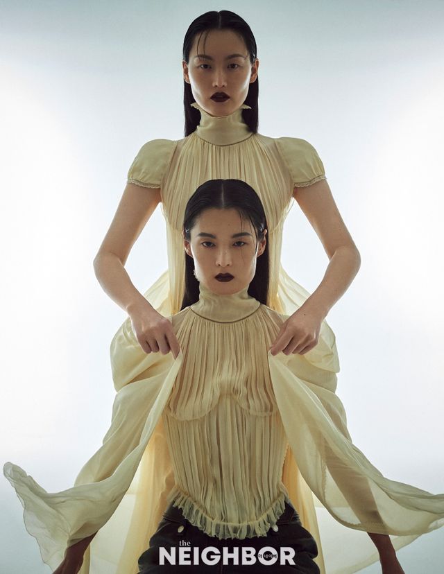 (위) 페일 옐로 시폰 소재의 플리츠 드레스 8백93만원.