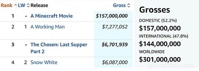 아울러 이번 성적은 역대 게임 원작 영화 중 가장 높은 오프닝 매출이기도 하다. 기존 1위는 2023년에 개봉한 슈퍼 마리오 브라더스(1억 4,630만 달러)였는데, 이번에 1억 5,700만 달러를 달성한 마인크래프트 무비가 선두로 치고 올라갔다. 슈퍼 마리오 브라더스의 전 세계 매출은 13억 6,000만 달러로 집계됐다. 마인크래프트 무비가 총 매출에서도 슈퍼 마리오 브라더스의 기록을 경신할 수 있느냐가 관심사로 떠오른다.