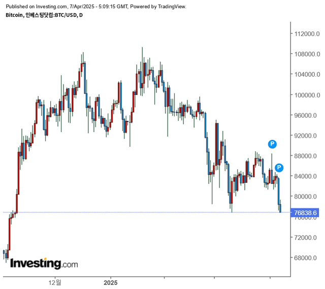 고율 관세 정책 발표 이후 급락세를 보이는 비트코인 차트/사진=인베스팅닷컴