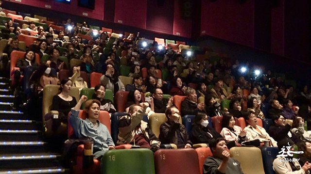 5일 메가박스 동대문에서는 싱어롱 상영회가 열려 영화의 주역들과 관객들이 눈물로 기쁨을 함께했다. ‘초혼, 다시 부르는 노래’의 후원자와 뉴스공장 신청자를 위한 이 상영회에서는 “저희 이야기에 관심을 가져 주시는 선배님들이 있다는 이야기를 듣고 들꽃소리 인사 드리러 왔습니다”라는 재치 넘치는 인사말로 노래패 들꽃소리 역의 배우들이 등장했다. 배우들은 팀복을 맞춰 입고 관객들과 함께 노래를 시작했다.