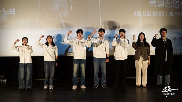 이날 배우들은 노학연대를 이뤄낸 벅찬 엔딩곡인 ‘그 날이 오면’, ‘임을 위한 행진곡’을 불러 영화의 감동과 여운을 관객들의 눈 앞에 실현시켜 관객들의 뜨거운 박수갈채가 터져 나왔다.