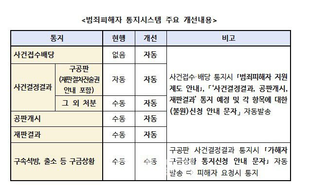 대검은 기존 피해자 통지시스템을 전면 개선했다. 사건접수·배당 통지를 신설하고 사건접수·배당, 사건결정결과, 공판개시 및 재판결과 등 주요 형사절차정보를 필요적 자동통지로 개선했다.