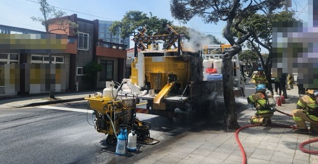 7일 제주도소방안전본부에 따르면 이날 오후 1시19분쯤 제주시 조천읍 함덕리의 한 도로에서 차선도색 작업을 하던 5t급 차량에서 화재가 발생했다는 신고가 접수됐다. <사진>
