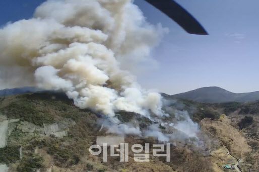 산불 1단계는 피해 예상 면적 10~50㏊, 평균풍속 3~7㎧, 예상진화시간 5~10시간으로 추정되는 산불이 발생했을때 발령한다. 불이 나자 산림당국은 진화헬기 15대와 장비 37대, 인력 105명을 긴급 동원해 진화 중이다. 산불영향구역은 12㏊, 화선은 1.4㎞이다.