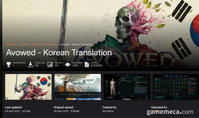 넥서스 모드(Nexus mods)를 통해 받을 수 있다. 제작자 설명에 따르면 이번 한국어 패치는 구글 생성형 AI 서비스인 제미나이(Google Gemini) 2.5 Exp로 초벌 번역했고, 용어 통일을 위한 1차 검수가 적용됐다. 이를 토대로 게임 텍스트는 99% 한국어로 번역됐다.