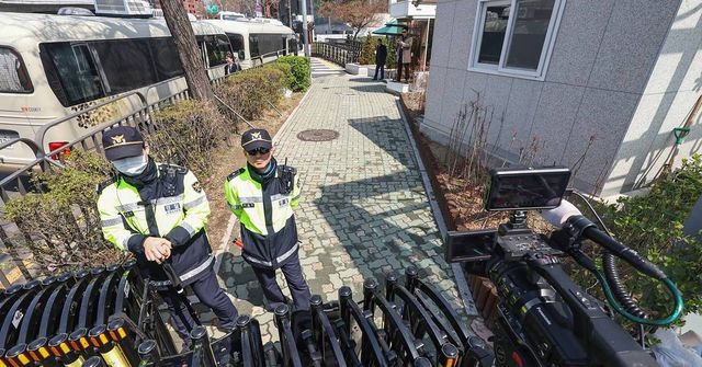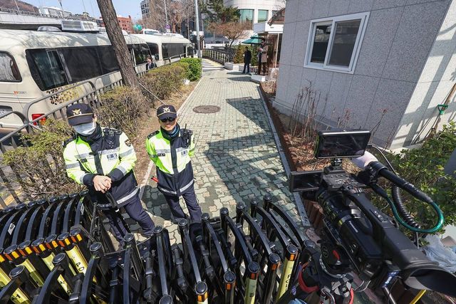윤석열 전 대통령 탄핵 사흘째를 맞는 지난 6일 서울 용산구 대통령 관저 앞에서 경찰 관계자들이 경계 근무를 하고 있다 / 뉴스1