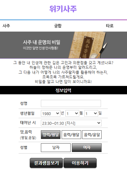 내 사주에 도화살이 있을까? 홍염살은 어디에 작용할까? 화개살이 있다면 나는 어떤 내면세계를 지녔을까? 궁금하다면 온라인 사주 전문 플랫폼 위키사주에서 생년월일만 입력해 간단하게 확인해보자. 나의 숨겨진 매력과 기질을 발견하는 순간, 당신도 몰랐던 진짜 ‘나’를 만나게 될지도 모른다.