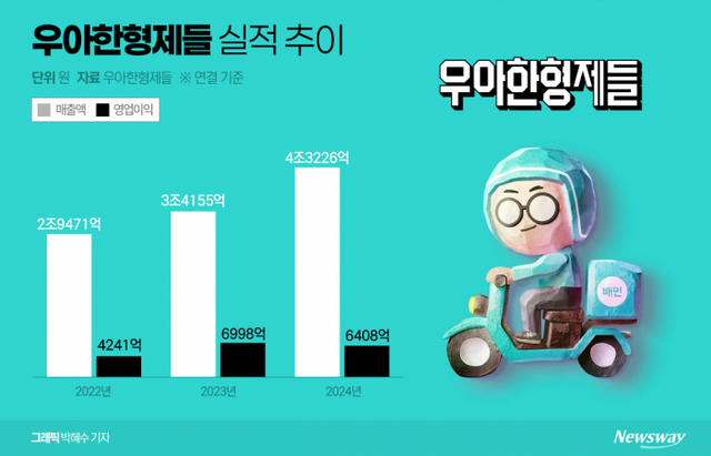 배달의민족을 운영하는 우아한형제들은 지난해 매출 4조3226억원으로 전년(3조4155억원) 대비 26.6% 증가했다. 배민의 매출이 4조원을 넘어선 건 처음이다. 그러나 이 기간 영업이익은 6408억원으로 전년(6998억원)보다 8.4% 감소했다.