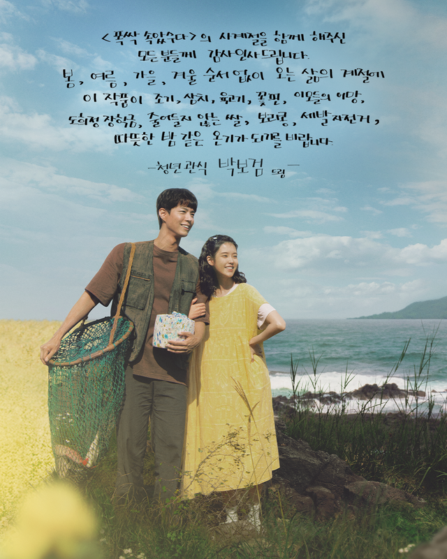 언제나 단단한 무쇠 같은 사랑을 보여준 ‘관식’ 역을 맡아 훈훈함을 자아낸 박보검은 “‘폭싹 속았수다’의 사계절을 함께 해주신 모든 분들께 감사 인사드립니다. 봄, 여름, 가을, 겨울 순서 없이 오는 삶의 계절에 이 작품이 조기, 육고기, 꽃핀, 도희정 장학금, 줄어들지 않는 쌀, 보리콩, 따뜻한 밤 같은 온기가 되기를 바랍니다”라며 작품과 시청자들에 대한 사랑을 아낌없이 드러냈다.