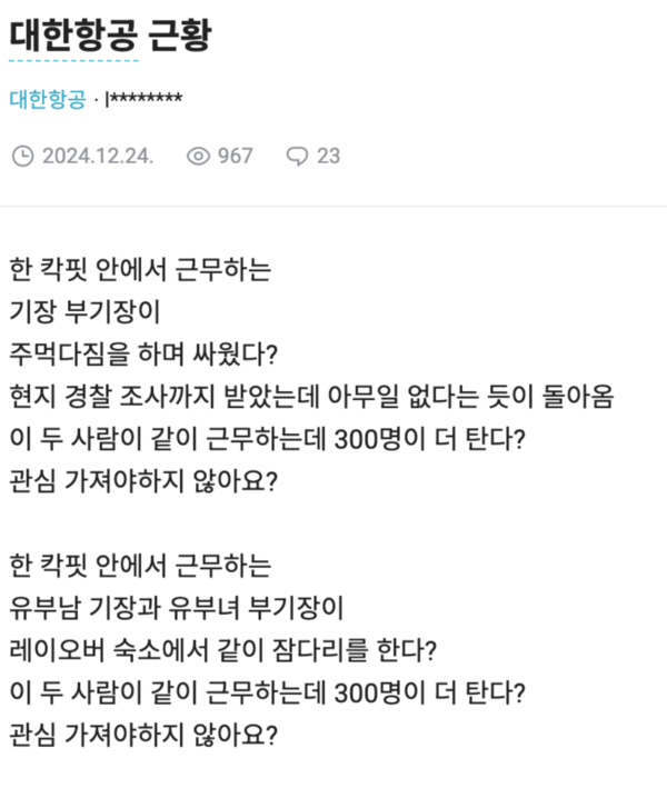 이번 사건이 호텔이라는 사적인 공간에서 발생했음에도 불구하고 면직이라는 가장 강력한 조치가 내려진 것은 조종사라는 직업의 공공성과 도덕성, 안전 책임이라는 무게를 고려한 결정이었다는 것이 사측의 입장이다.