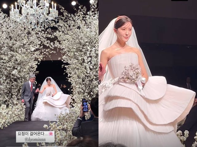 뿐만 아니라 효민은 화려한 웨딩드레스로도 많은 주목을 받았다 효민이 1부에서 착용한 드레스는 2025 S/S 사라므라드 하이엔드 웨딩드레스로 국내에 단 2벌만 있는 것으로 알려졌다. 풍성한 라인과 독특한 디자인으로 효민을 럭셔리한 자태를 과시했다.