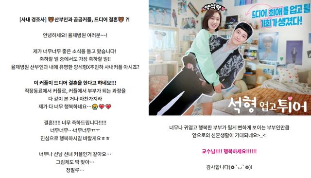 이어 게시글에는 "안녕하세요! 율제병원 여러분~~! 제가 너무너무 좋은 소식을 들고 왔습니다! 축하할 일 중에서도 가장 축하할 일!! 율제병원 산부인과 내에 유명한 양석형X추민하 사내커플 아시죠? 이 커플이 드디어 결혼을 한다고 하네요!!!"라며 두 사람의 결혼 소식을 전했다.