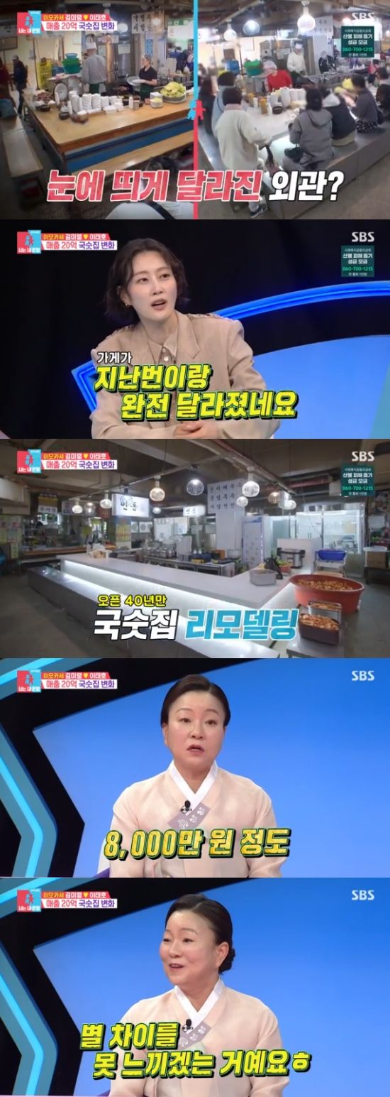 김미령은 "8000만원 들여서 리모델링을 했는데, 손님들이 앉아 계시면 별 차이를 못 느끼겠더라. 앉아 있을 때는 티가 안 난다"면서 아쉬워해 웃음을 자아냈다.
