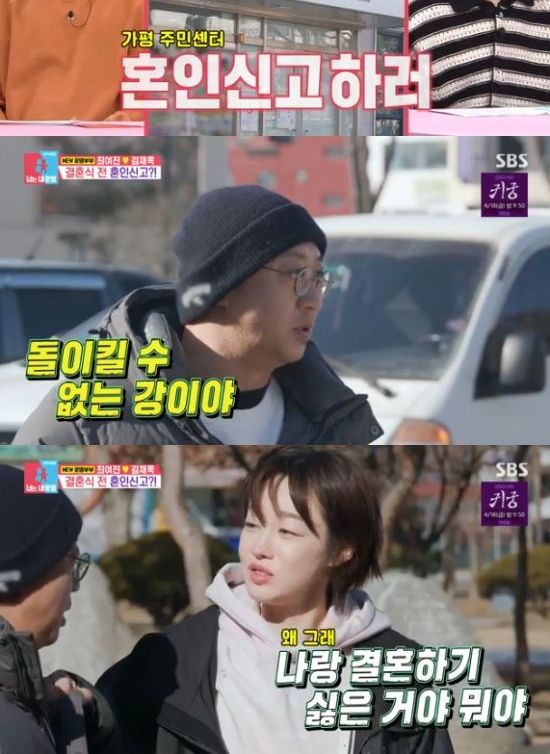 그리고 이날 최여진은 김재욱을 데리고 주민센터를 찾았다. 설렘 가득한 최여진과는 달리 김재욱은 "진짜 신중해야 해. 잘 생각해봐"라고 했고, 이에 최여진은 "어차피 결혼할건데 혼인신고부터 하자. 너무 시끄러운 소리 나는 것도 싫고, 빨리 혼인신고 하고 마음 편하게 있고 싶다"고 말했다.
