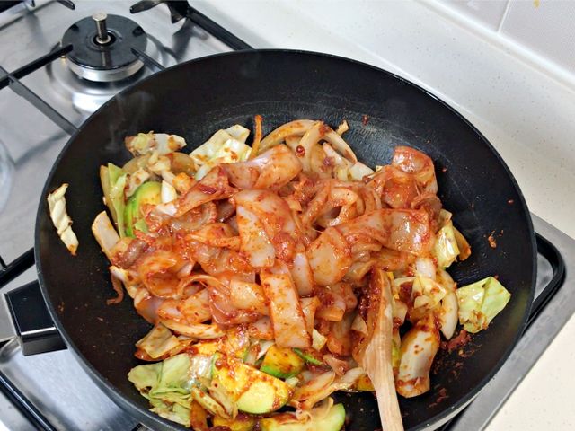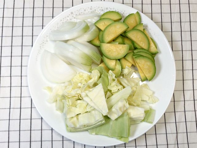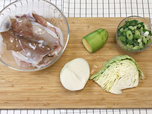 재료는 오징어, 양파, 호박, 양배추, 대파.