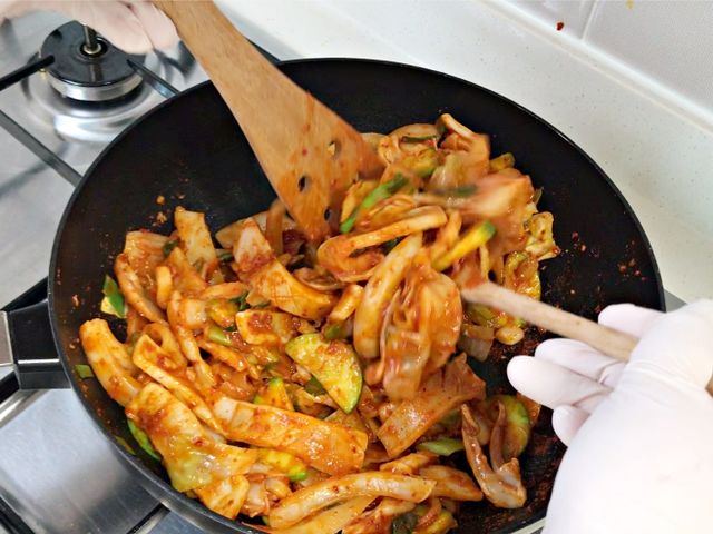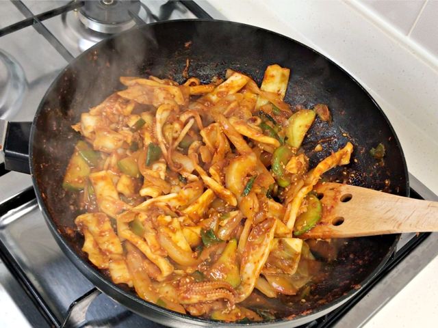 오징어는 오래 볶으며 식감이 질겨서 맛이 떨어져요.