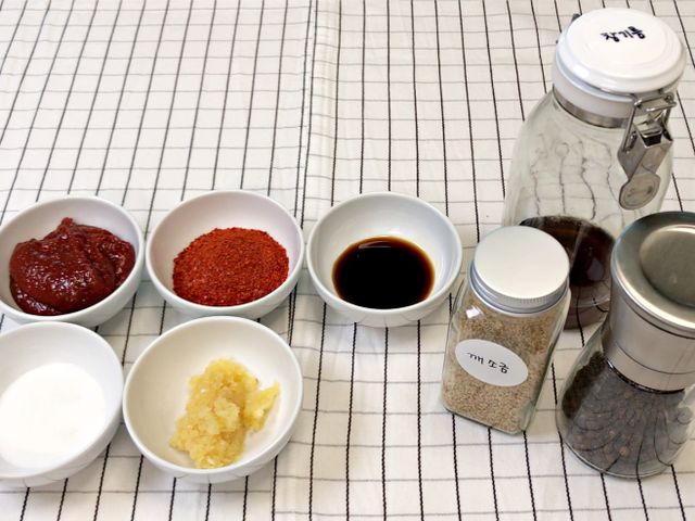 양념은 고추장, 간장, 고춧가루, 설탕, 다진마늘,