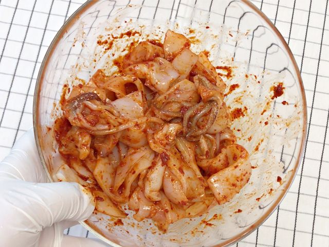 손질한 오징어에 양념장 반 넣고 미리 버무려요.