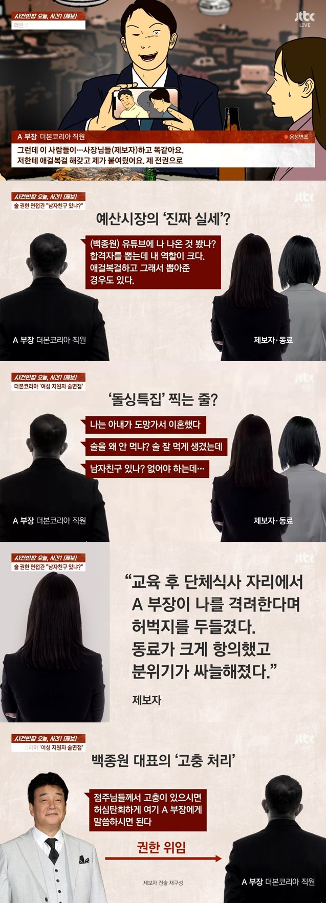 7일 방송된 JTBC '사건반장'은 백종원이 운영하는 더본코리아의 면접이 술자리에서 진행됐다고 방송했다.