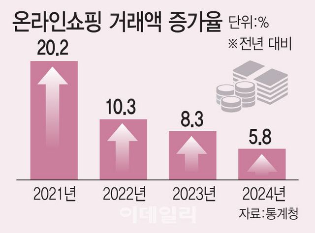 7일 통계청에 따르면 지난해 온라인쇼핑 거래액 증가율은 2001년 관련 통계가 작성된 이후 역대 최저치를 기록했다. 온라인쇼핑 연간 거래액의 전년대비 증가율은 지난 2021년(190조 2231억원) 20.2%에서 지난해(242조 897억원) 5.8%로 성장세가 가파르게 둔화되고 있다.
