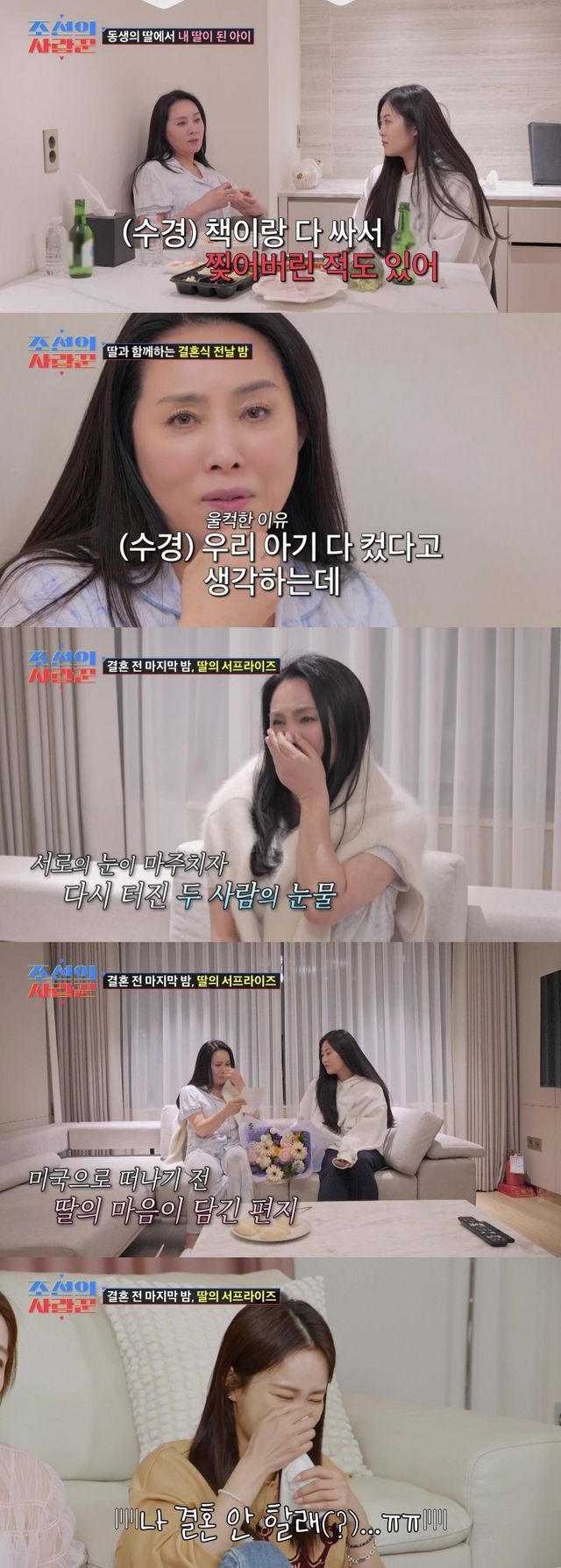 이를 본 최성국은 "옛날에 수경 누나가 '난 잘 안 운다. 평생 울 울음을 예전에 다 울었다'고 말했던 게 생각난다"고 전해 긴 여운을 안겼다. 이윽고 양수경은 결국 참아왔던 눈물을 터트렸다. 딸과 함께 눈물을 흘리던 그는 "속으로 ‘우리 아기 이제 다 컸네’ 생각했는데, 결혼하면 더 이상 아기가 아니지 않냐"며 울음을 삼켰다.