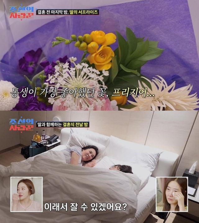 그리고 꽃다발 속에서 여동생이 가장 좋아했던 프리지어를 발견한 양수경은 "프리지어 보면 동생 생각에 하도 울어서, 집에는 안 꽂아둔다"며 처음으로 딸에게 프리지어에 얽힌 슬픈 사연을 전해 다시금 눈물바다를 만들었다.