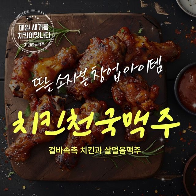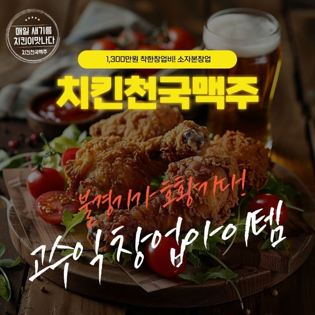소자본창업 아이템으로 요식업 예비창업자의 선호도 1위 메뉴인 치맥 인기가 높아진 가운데, 치킨과 살얼음 맥주의 치킨천국맥주가 1300만원 착한 창업비로 창업 지원을 확대한다고 밝혔다.