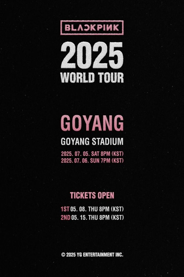 소속사 YG엔터테인먼트가 8일 공개한 포스터에 따르면 고양 공연 선예매는 오는 5월 8일 오후 8시부터 11일 오후 11시 59분까지 인터파크 티켓에서 진행된다. 위버스 내 BLINK MEMBERSHIP 가입자를 대상으로 하며, 누구나 자유롭게 구매 가능한 일반 예매는 오는 5월 15일 오후 8시부터 시작된다.