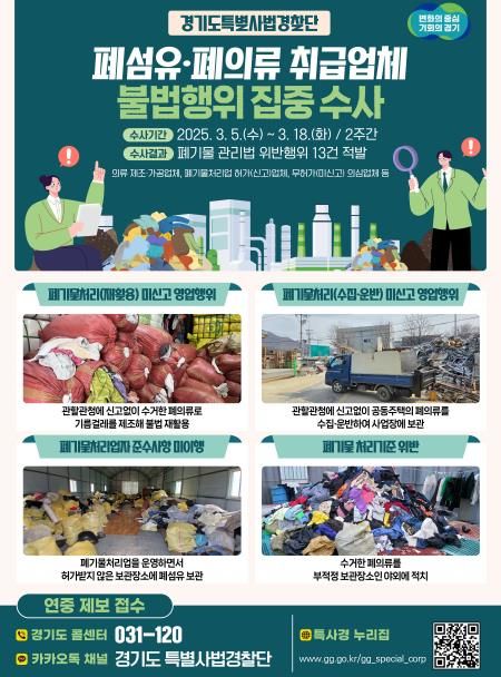 도는 짧은 소비주기로 폐섬유·폐의류 발생량이 급증하면서 처리업체들이 우후죽순 생겨나고 있으나, 일부 업체들의 부적정 처리로 인해 환경오염이 심각한 사회문제로 대두되고 있어 이번 수사를 기획했다고 설명했다.